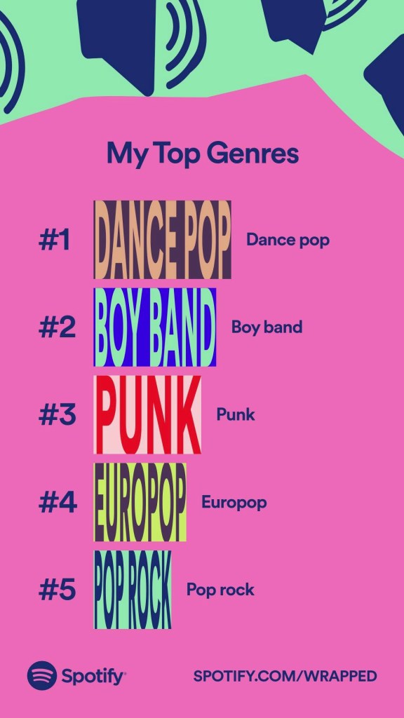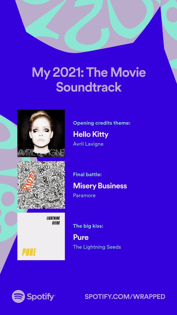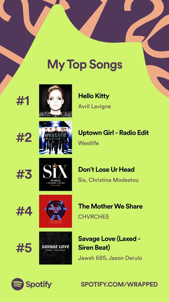 2021 was Britney’s year, and I know I’m not alone in having her in my top 5. Same with Taylor, although I’m a little more surprised by that one since I’m not a huge fan. Backstreet Boys are always close to my heart. And I guarantee Avril is only there because of fucking “Hello Kitty”.
